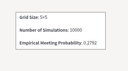 You and a friend live N blocks away from each other on a square grid. You both decide to take random walks towards each other. You flip coins at the same time and each go left or right depending on result. What are the chances you run into each other? Write a streamlit dash to illustrate.