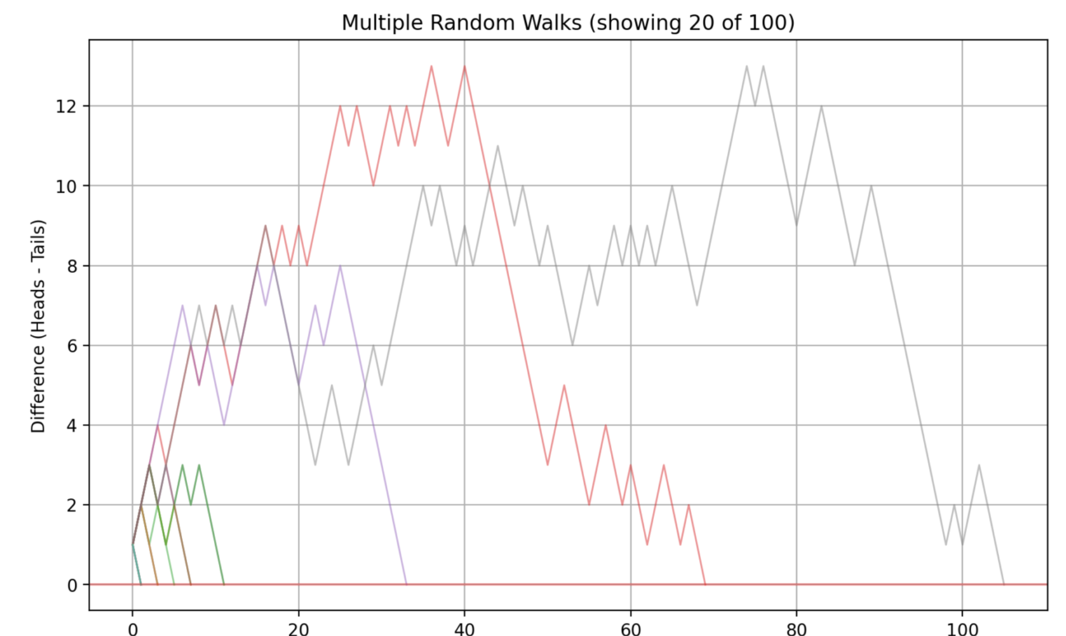 Use random walk as solution basis. Reduce problem to counting paths in sub-square. Reduces to Catalan numbers – 1/(n+1)(2n n)